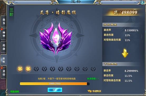 魔核提升后可增加暴击率、暴击伤害以及对怪物的暴击伤害