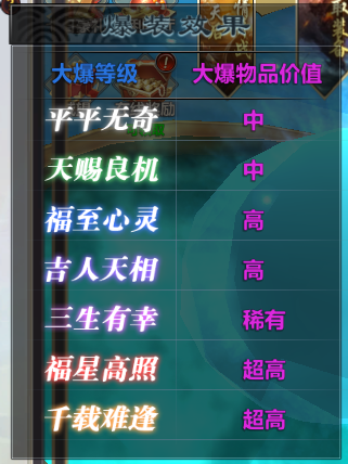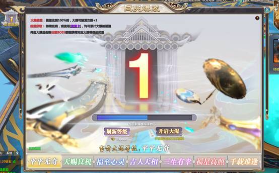 使用元宝/钻石可以刷新大爆等级,每次刷新时,大爆等级有几率上升一级