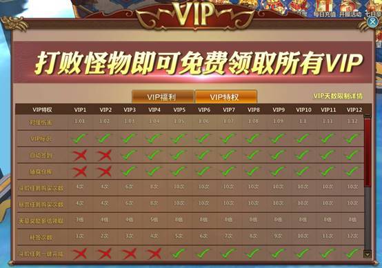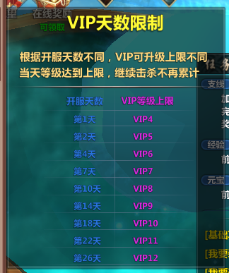 VIP天数限制:根据开服天数不同,VIP可升级上限不同,当天等级达到上限,继续击杀不再累计