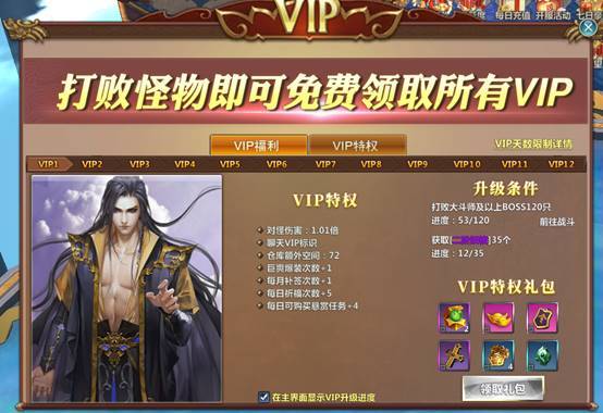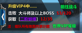 VIP功能开启等级:200级 功能介绍:击败怪物达成升级条件即可提升VIP等级,并可领取VIP福利,获得VIP特权,打败怪物会掉落升级VIP所需要消耗的妖核 升级条件:升级VIP需要击败一定数量的相应VIP等级所要求的怪物,并获得一定数量相应妖核,之后便可免费提升VIP等级