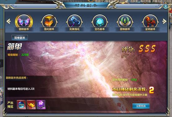 副本功能:副本可以获得翅膀、锻造强化、宝石、魔核、坐骑的升级材料,以及大量经验与元宝 副本内容:材料副本包括:翅膀副本、强化副本、完美强化、宝石副本、魔核副本、坐骑副本,每个副本每日默认可以进入2次,提升仙阶或VIP可获得额外次数,挑战次数每日0点重置