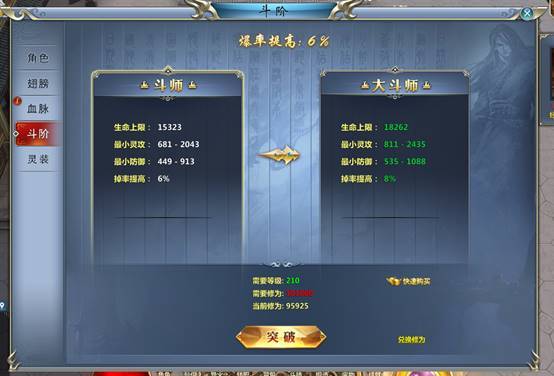 开启方式:角色210级时开启 系统功能:消耗修为提升斗阶 斗阶提升后可获得属性的提升 斗阶提升还能获得斗阶地图的进入许可,可挑战更多的BOSS 修为获取:每日可消耗元宝兑换修为 每日参加护送药材也可获得大量修为