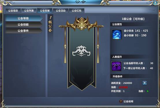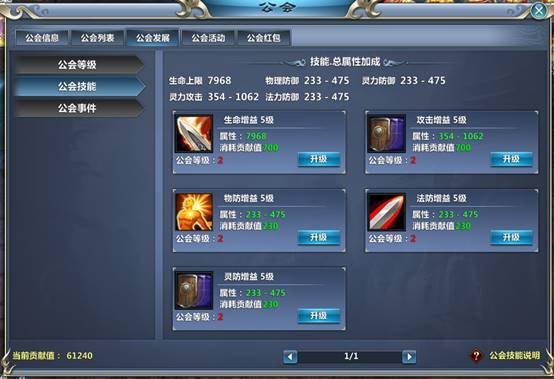 系统功能:公会贡献值可用于强化公会属性 公会等级越高,公会属性可升级的次数就越多