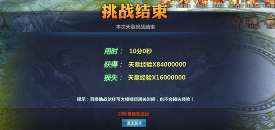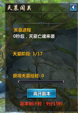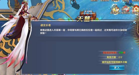 开启方式:角色210级时开启 系统功能:每日有2次进入天墓次数,进入天墓副本可获得大量经验 天墓次数增加:提升仙阶可获得额外进入次数