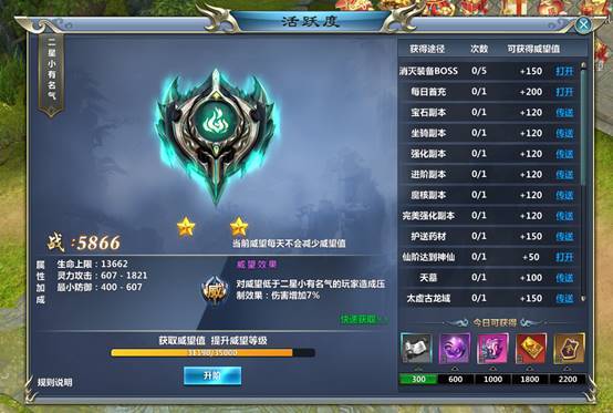 开启方式:角色145级时开启 系统功能:威望高的玩家对威望低的玩家拥有战斗优势,自身能获得7%伤害加成 提升威望同时能获得一定的属性加成 威望升级:可通过完成每日的活跃度获得威望值 激活特权每日可获得一定的威望奖励 每日活动中的威望任务也可获取威望值
